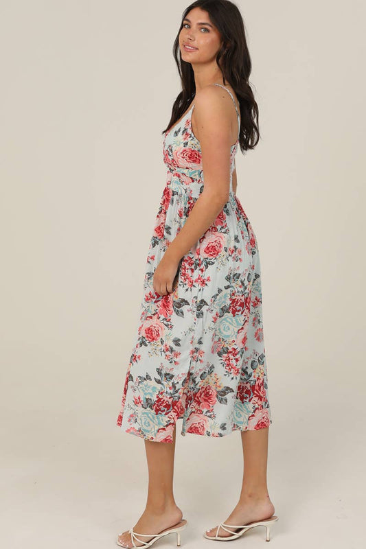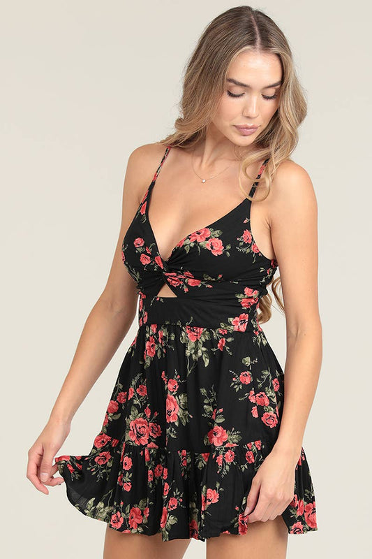 V NECK TWIST FRONT CUT OUT FLORAL PRINT MIDI DRES