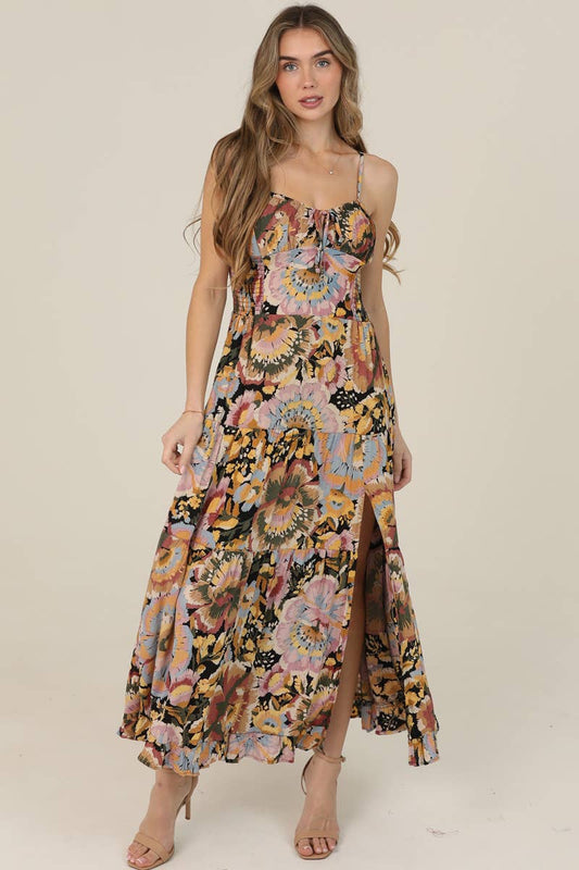 FLORAL PRINT TIE BUST MAXI DRESS WITH SIDE SLIT